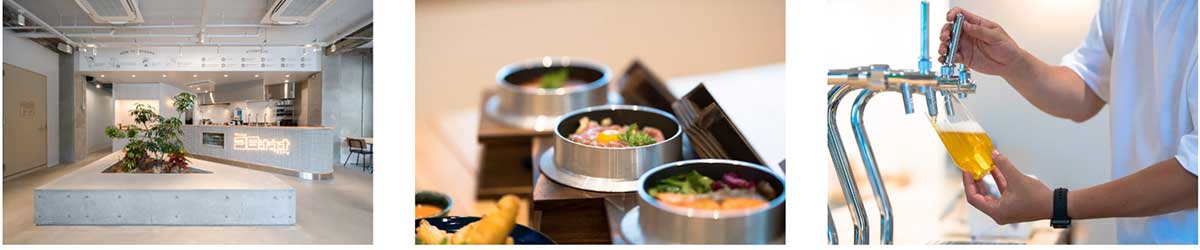 受付となる36ラウンジは2Fにあります。グループでご利用の際も安心して待ち合わせることができるほか、併設されたキッチンでは、サウナ後のお楽しみになるサ飯を多数用意しています。一番のオススメである”36釜飯”は、山側らしい山菜だけでなく海の幸も揃え多彩なバリエーションが楽しめるほか、“ととのい”の後に沁みる美味しい自慢のビールもご用意しています。