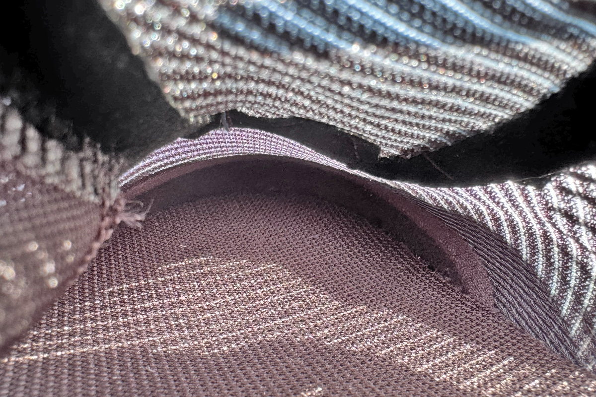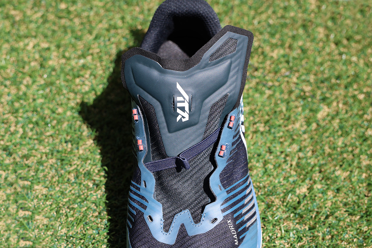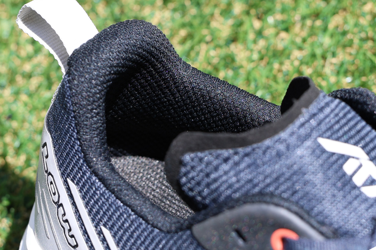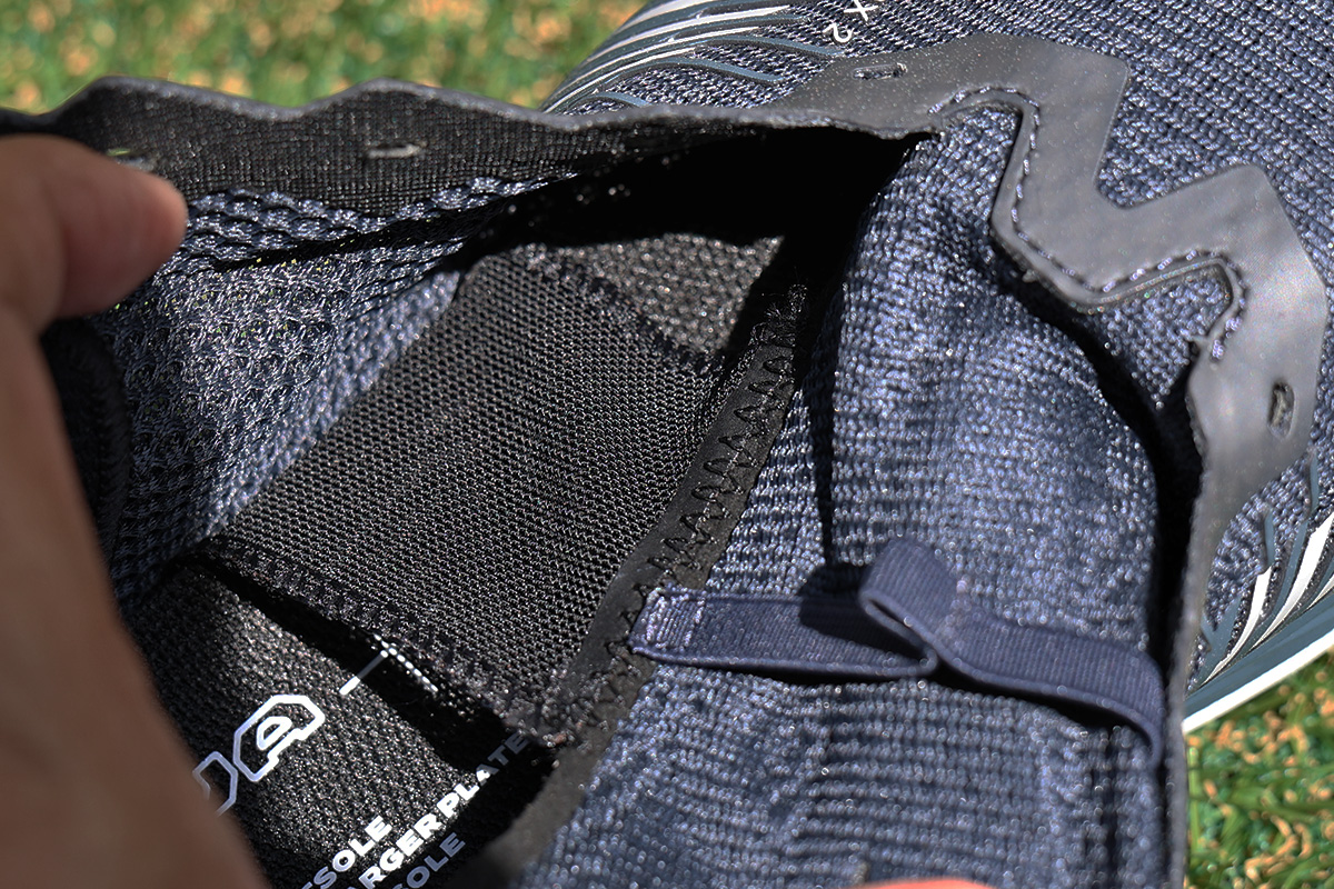 左右非対称のタンはソールと接続され、極薄のメッシュ素材に適度なパッドを組み合わせた設計で、ホールド感とダイレクト感のバランスに優れています。履き口は人間工学に基づいた左右非対称デザインで、くるぶしへの干渉を軽減します。