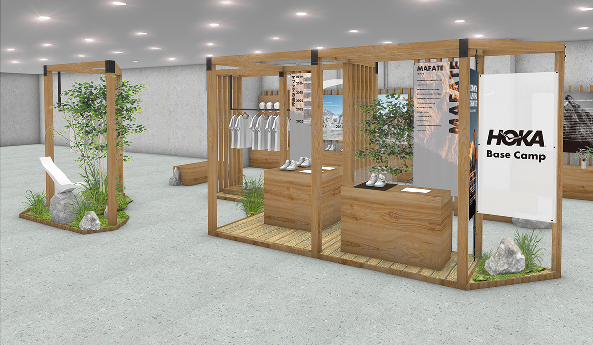 併設されたブランドスペース「HOKA BASE CAMP」では、HOKAの原点である山々をイメージし、木目や岩の素材を取り入れた空間に。ブランドのヒストリーや、アルプスの山々で誕生したHOKAのルーツを語るトレイルランニングシューズのアーカイブモデルを展示。さらに、UTMB開催を記念し、レースの映像も紹介されます。