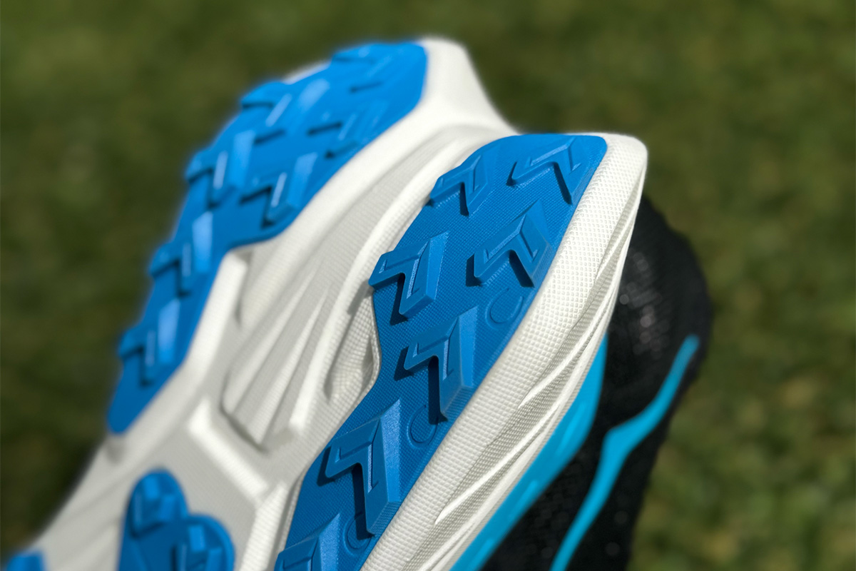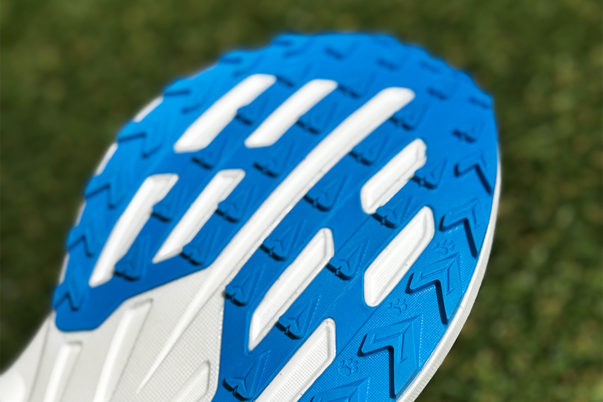 アウトソールには軽量ゾーンラバーを採用し、不要な重量を削りながらも最適なグリップ力を確保。高さ3mmのラグは、砂利道やライトトレイルをグラベルバイクのタイヤのようにしっかりと捉え、高速走行時でも安定したトラクションを提供します。ラグが浅めなのでスピードランニングに最適化された設計が、舗装路からダート道への移行でもスムーズな走行感を維持します。