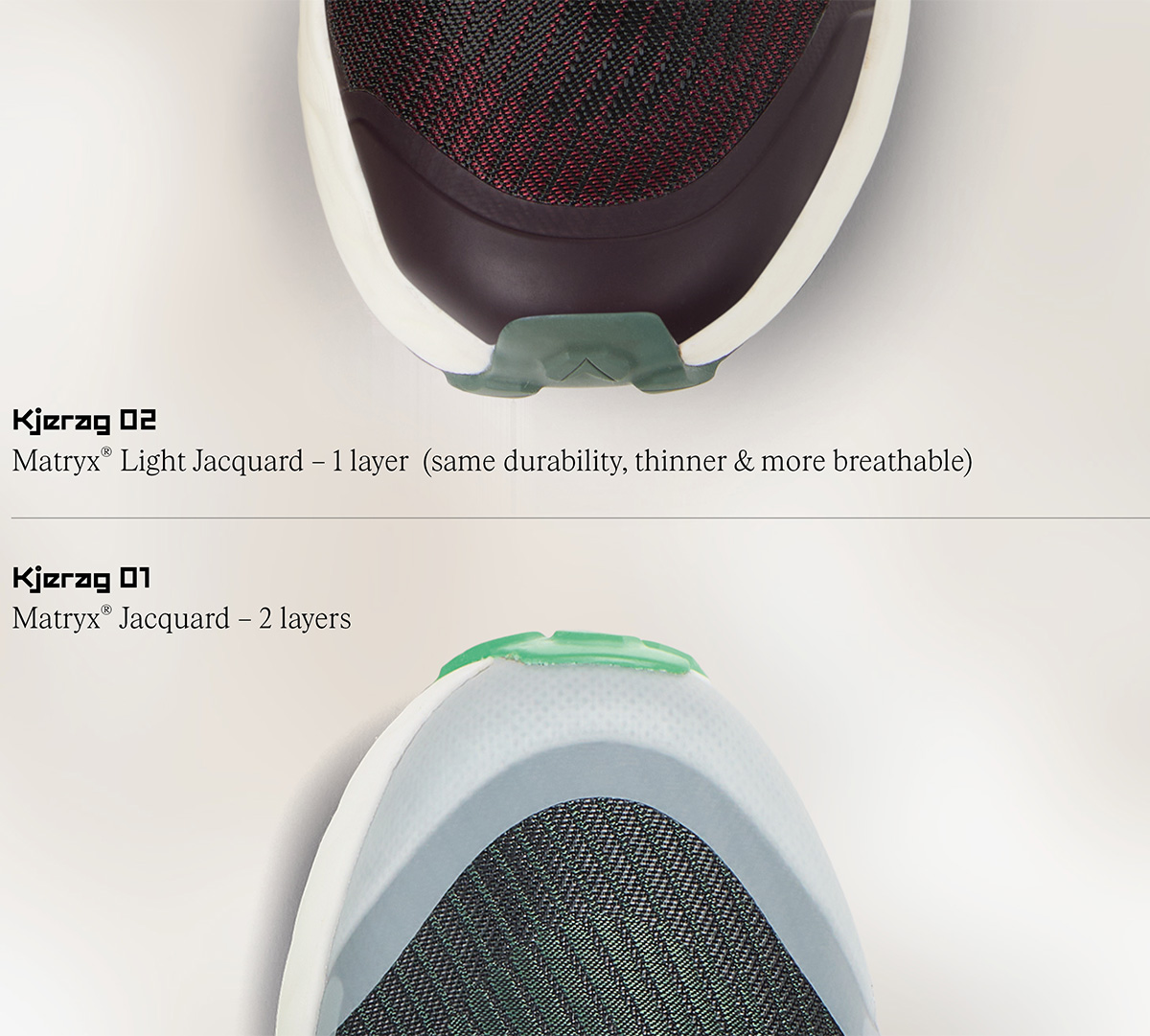 「Kjerag02」は、定評のあるアウトソール(Vibram® メガグリップ ライトベース)はそのままに、さらなるスピード、快適性、耐久性を追求し再設計されました。