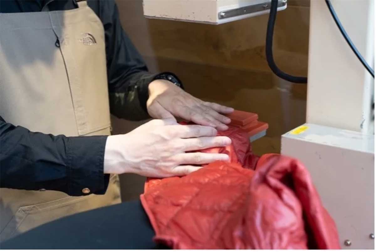 防水性ジャケットやダウンの破れの修理を専用のヒートプレス機を用いてリペアパッチ圧着修理を行います。