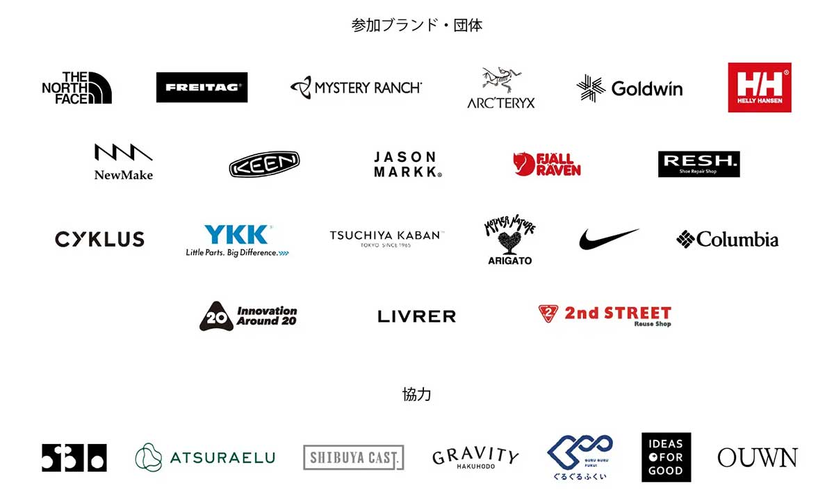・参加ブランド・団体:THE NORTH FACE (ザ・ノース・フェイス)、 FREITAG (フライターグ)、 ARC’TERYX (アークテリクス)、 Goldwin (ゴールドウイン)、 HELLY HANSEN (ヘリーハンセン)、 MYSTERY RANCH (ミステリーランチ)、 NewMake (ニューメイク)、 KEEN (キーン)、Jason Markk (ジェイソンマーク)、 FJALLRAVEN (フェールラーベン) 、 RESH (リッシュ)、 CYKLUS(サイクラス) 、YKK(ワイケイケイ)、TSUCHIYA KABAN(ツチヤカバン)、HOLLYWOOD RANCH MARKET(ハリウッドランチマーケット)、Nike(ナイキ)、Columbia(コロンビア)、青山学院大学登録団体 Innovation Around20(アラウンドトゥエンティ)、 LIVRER(リブレ)、2nd STREET(セカンドストリート)