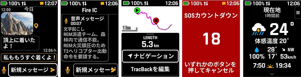 ・inReach機能:衛星通信を介した双方向通信、トラッキングと現在地のLiveTrack(衛星使用)、インタラクティブSOS発信、写真と音声メッセージの送信、グループトラッキング/メッセージ
