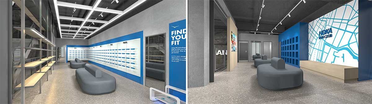 カーを28台完備。また、フロアのシンボリックなデザイン要素として「HOKA Shibuya」と「HOKA Harajuku」の位置をHOKAのバードマークで示した渋谷・原宿エリアのマップウォールを設置。ベンチやゆったりとしたソファーを配置し、イベント開催時などにランナー同士の交流を深める場となっています。