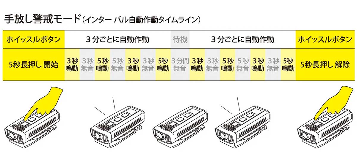 通常は押している間にホイッスルが鳴りますが、5秒間長押しで「手放し警戒モード」に切り替わり、自動で連続して電子ホイッスルを鳴らすこともできます。