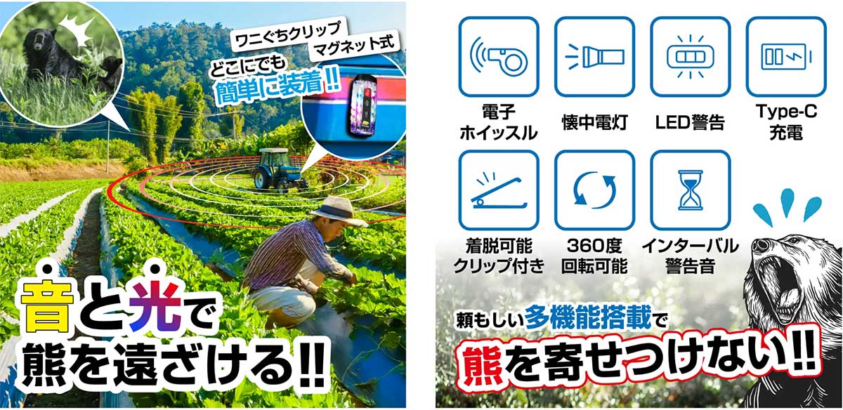 昼夜を問わず遠方から視認可能な高輝度発光と、熊が嫌う高周波・断続音によって、熊の接近を予防します。充電式(Type-C)で最大8時間のLED点滅連続使用が可能。ワニぐちクリップ・マグネット式など複数の装着方法に対応し、畑仕事や登山、林業、農業などにおいて、熊に遭遇するリスクを回避するためのアイテムです。