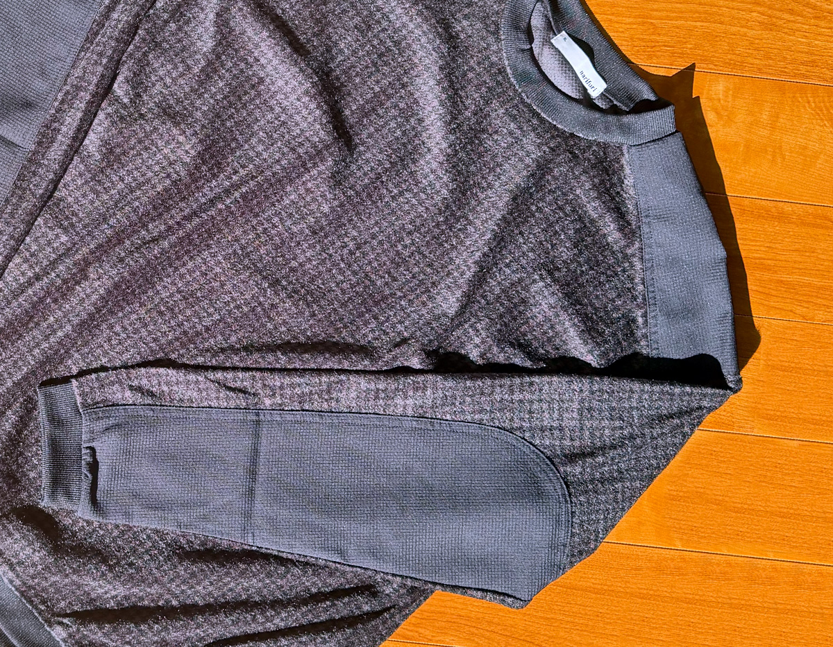 Octa素材をベースにしたクルーネック。ブラウン系のハウンドトゥース柄をプリントすることで、スポーティになりすぎない表情を実現しています。アクティブインサレーションとしての機能性を持ちながら、ジャケットのインナーとしても使える汎用性の高さが特徴です。