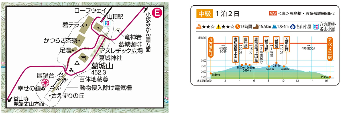 また、小冊子のコースガイドには高低差グラフや写真を追加し、日帰り向き・宿泊向きなどプラン提案も強化。さらにアイコンの改良や表示の視認性向上、主要な山頂からの展望図、登山口へのアクセス案内図の追加など、実用性をより高めています。