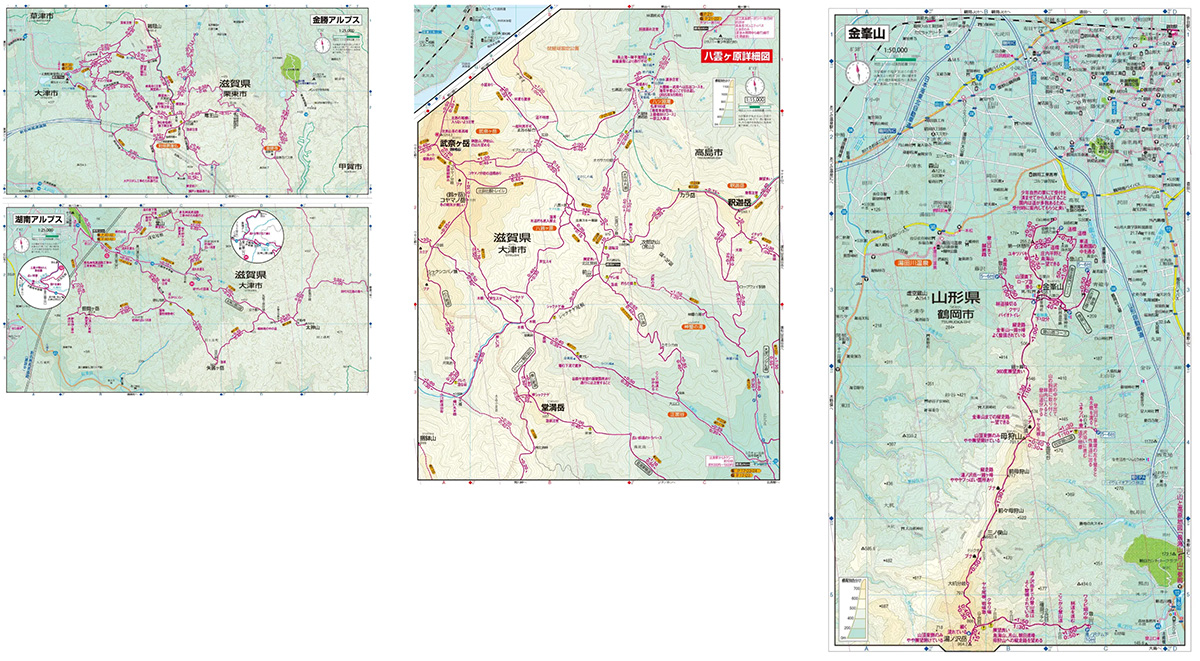 収録図例(左)御在所・霊仙・伊吹。(中)比良山系。(右)追加した山域(朝日連峰) ※内容は変更の可能性があります。