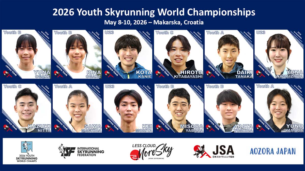 2026年5月8-10日にクロアチア・マカルスカで開催される「2026ユーススカイランニング世界選手権(2026 Youth skyrunning world championships)」の日本代表“AOZORA JAPAN”のメンバーを発表します。23歳以下の若者を対象としたユース世界選手権は2016年より毎年開催されております。今回は12名の選手が世界最高峰の舞台に挑みます。