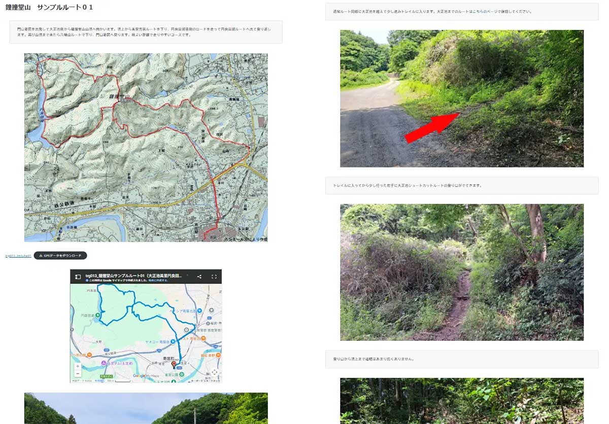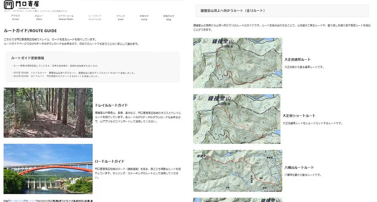今回、門口寄居の公式ホームページ上では、周辺の山のトレイルルートおよび舗装されたロードルートのルートガイドページを公開しました。すべて無料で利用できます。