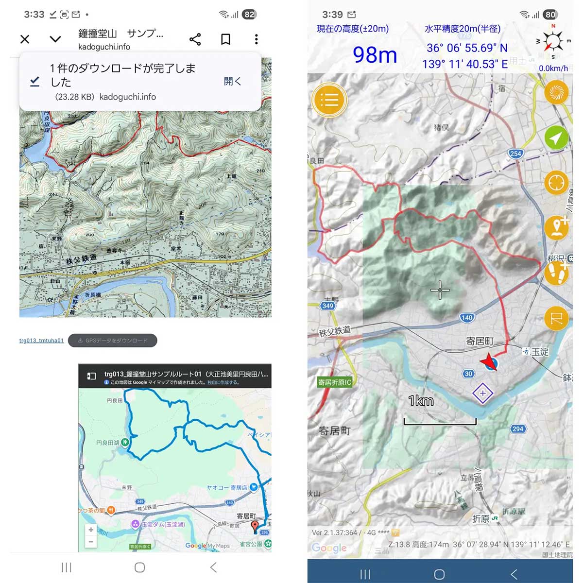 スマートフォンでのダウンロード、山アプリ(Geographica)での使用画面