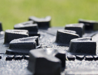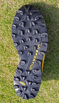 ミッドソールの衝撃吸収性も向上しています。アンチトーションスタビライザーというプレートも内蔵されているため、ねじれ剛性も強くその反発も上手く推進力に変換されているようです。アウトソールのコンパウンドは軽量で耐久性のあるFriXion ATを採用、さらにラ・スポルティバのお家芸的テクノロジーであるインパクト・ブレーキシステムも、もちろん採用しています。これは、アウトソールの凸凹の凸の先端の接地部分が平らではなく交互に斜めに角度をつけるという手法です。この結果、トレイルでの登り、下りにおいて、平らではない路面状況でも必ずアウトソールが噛んでくれます。また、このブロックパターンは衝撃吸収にも一役買っています。各ブロックの凸の部分に角度が付いているため、最初に設置下部分がつぶれてから全体が接地することになり、ここで衝撃を緩和しているのです。岩などを走ると、意外に突き上げ感が少ないのはアウトソールのおかげもあるのではないかと思います。また、踵部分はアウトサイドが少し低くなってます。このため、踵着地をした場合はオーバープロネーション気味の走り方をしても、自然に矯正されて適切な荷重移動をすることができます。