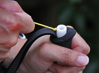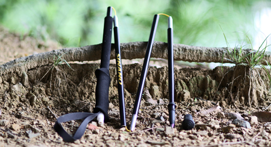 4ピースに分かれて折りたためるこの「トレランポール12」。すべてがコードでつながれています。組み立て方はいたって簡単。グリップを握ってだらんとぶら下げたら、上部のロープを引き上げるだけ。あとはコードをグリップ上部の溝に挟み込めばOK。セッティングには1本10秒もかかりません。もちろん、分解もその逆を行うだけなので、一瞬です。