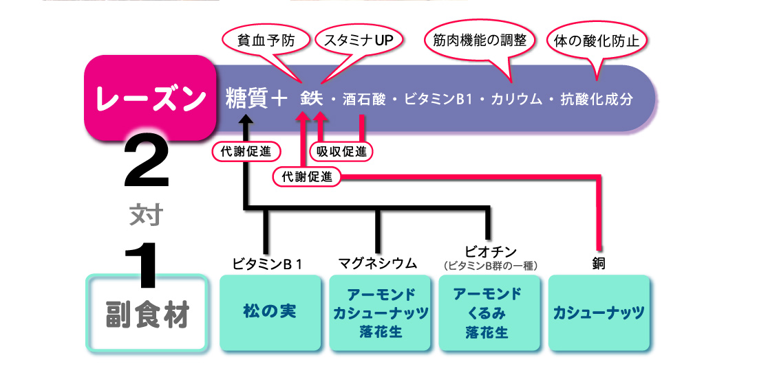 さらに、レーズンは汗とともに失われてしまう鉄やカリウムなどのミネラル・ビタミンをバランスよく含んでいます。