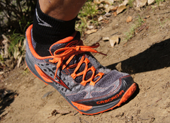 その名の通り7世代目となるBROOKSのカスケディア。あのスコット・ジュレック選手との共同開発で、もちろん彼自身も使用するモデルです。ランニングシューズメーカーらしく、足入れした印象はトレーニング用のロードランニングに近いイメージ。一昔前はトレイルランニング用のシューズとしてはかなり戦闘的なイメージだったかもしれませんが、より軽く、より薄くなってきた昨今のシューズの中で見渡すと中間的なモデルといえると思います。実際、BROOKSのすべてのランニングシューズの中での位置づけは、クッション、プロネーションともに最も中庸な位置づけとなっています。