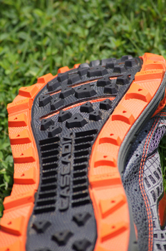 アウトソールはロードランニングシューズでもお馴染みのキャタピラー・クラシュパッドや、トレイルの尖った障害物から足を保護するバリスティック・ロック・シールドなどが装備されています。トレッドパターンはどのようなサーフェスでもグリップを発揮するオールラウンドなタイプに感じました。